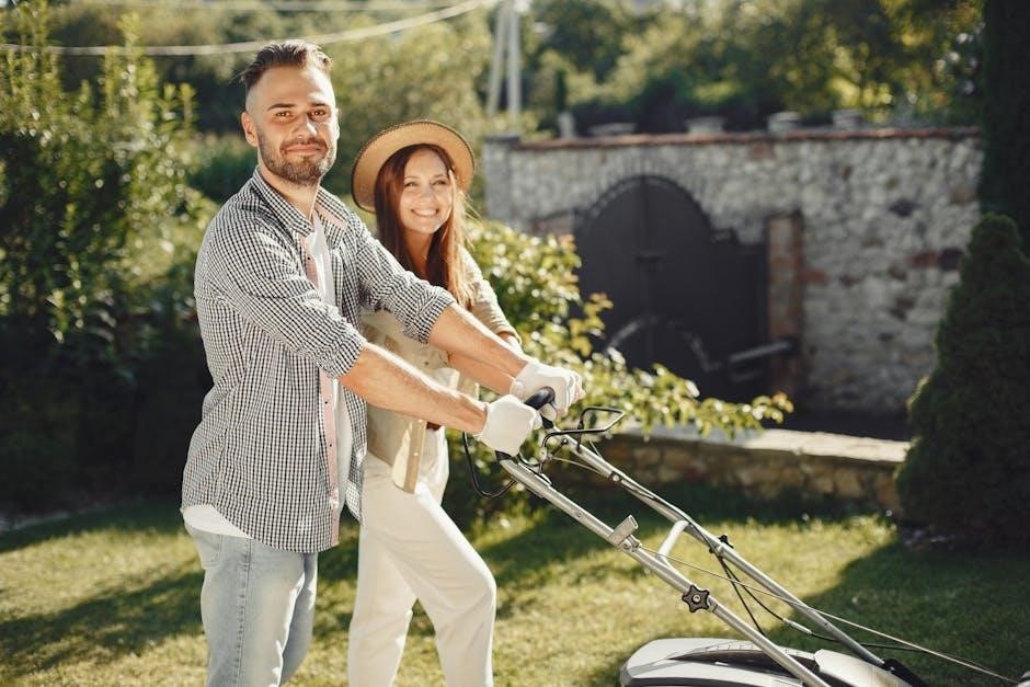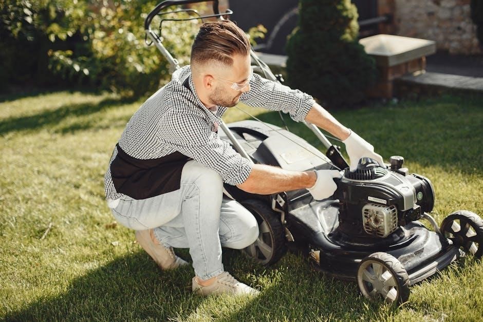 Spark plug problems, such as fouling or damage, prevent ignition; the manual provides guidance on inspection, gap adjustment, and replacement. Battery issues, particularly with electric start models, require checking connections and ensuring sufficient charge. Consult the manual’s wiring diagrams for accurate troubleshooting. Remember to disconnect the battery before any maintenance. Following the manual’s procedures ensures safe and effective engine starting problem resolution, restoring your mower’s functionality.